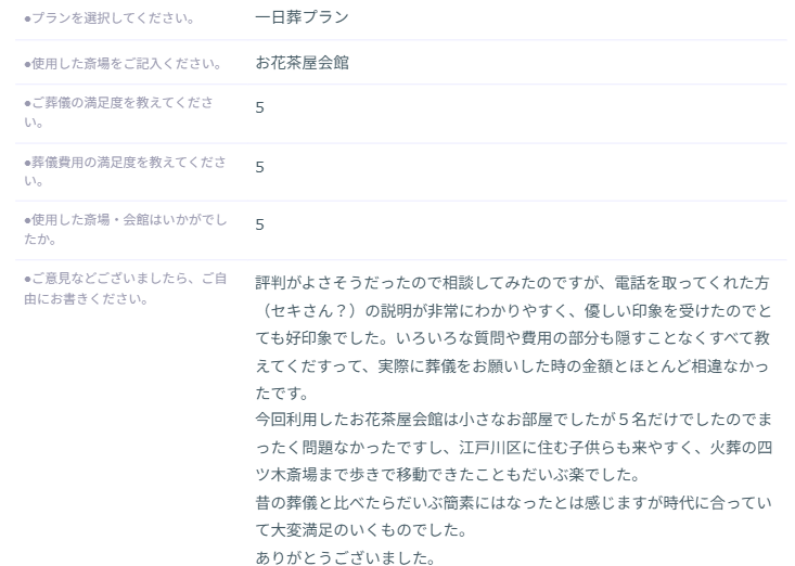お客様評判がよさそうだったので相談してみたのですが、電話を取ってくれた方(セキさん?)の説明が非常にわかりやすく、優しい印象を受けたのでとても好印象でした。いろいろな質問や費用の部分も隠すことなくすべて教えてくだすって、実際に葬儀をお願いした時の金額とほとんど相違なかったです。
