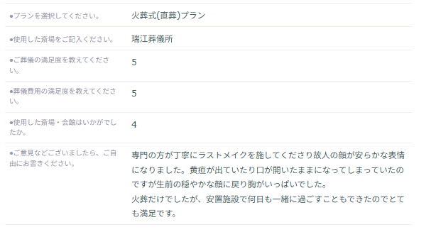 火葬だけでしたが、安置施設で何日も一緒に過ごすこともできたのでとても満足です。