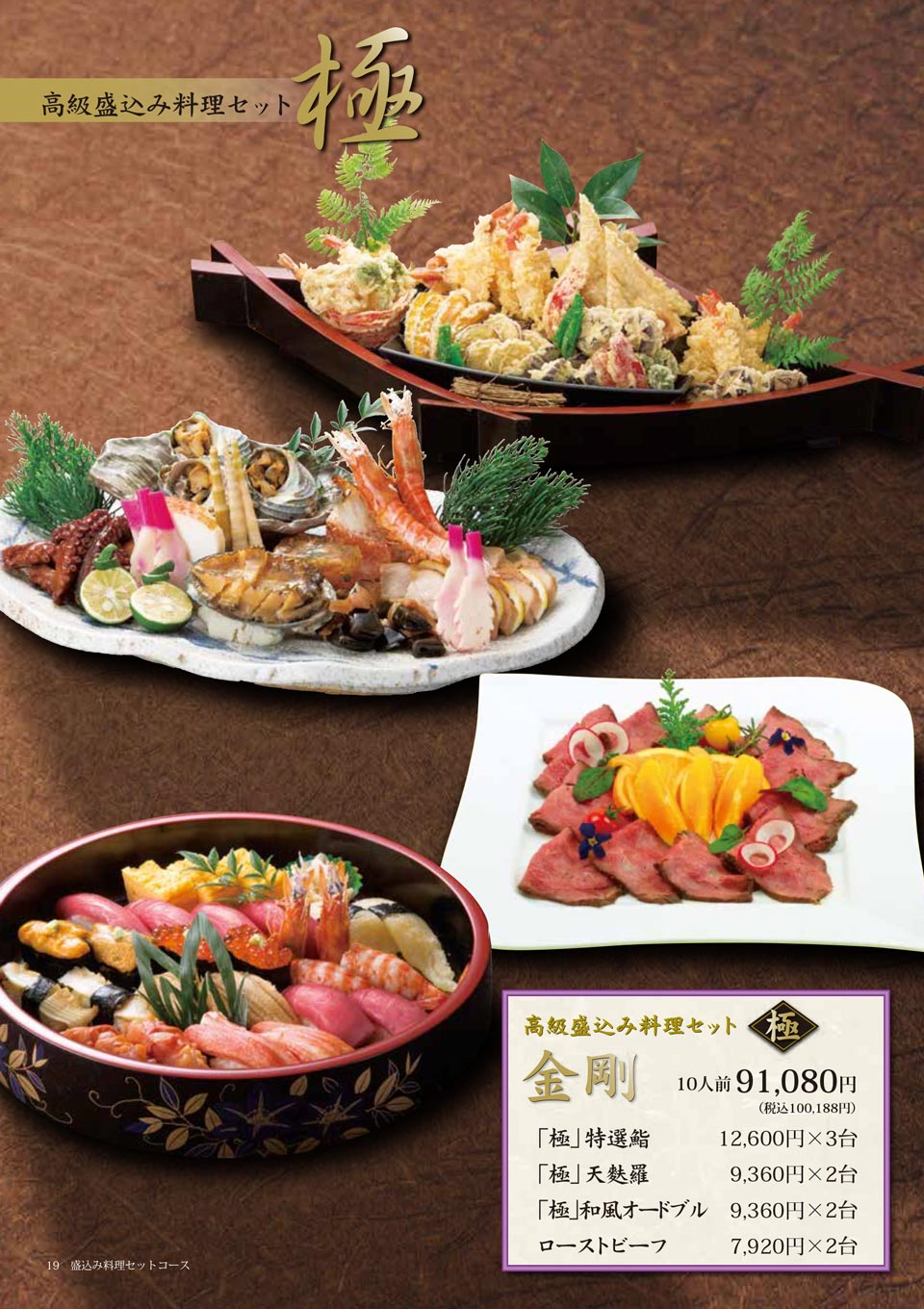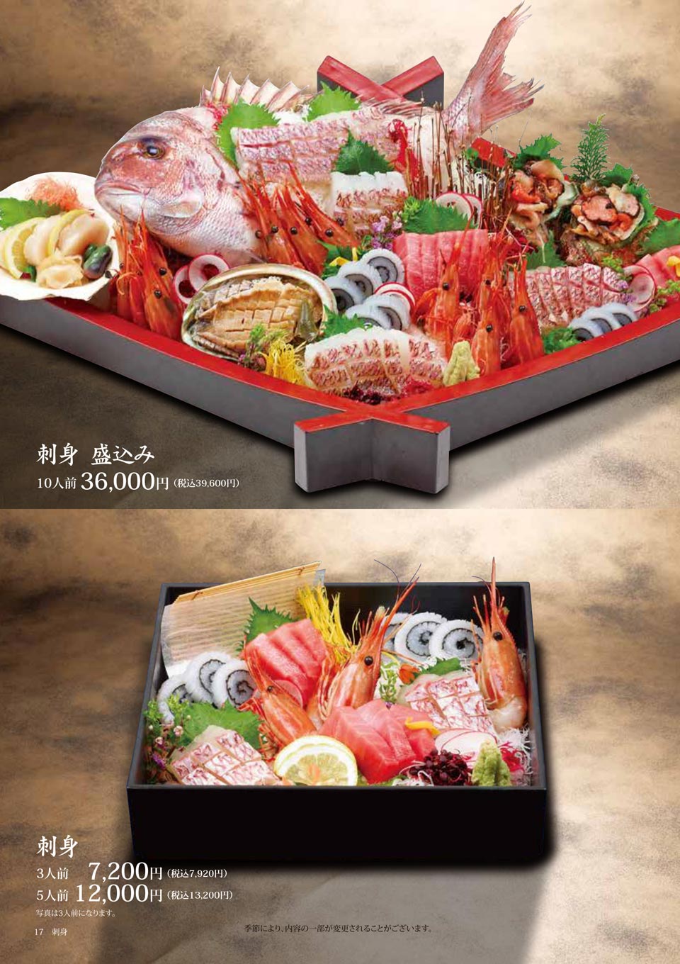 | 刺身 盛込み | 10人前:36,000円(税込39,600円) |
