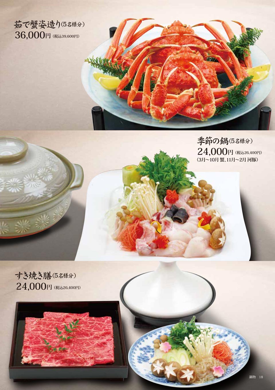 | 季節の鍋(5名様分) 3月〜10月:蟹 11月〜2月:河豚 | 24,000円(税込26,400円) |